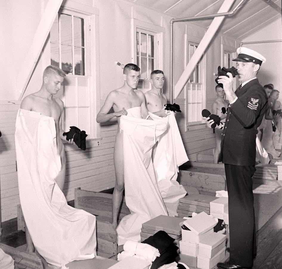 Today’s Memorial Day “Pic of the Day” captures a striking moment of transition: young Navy recruits receiving their first uniforms at boot camp, likely in Great Lakes, Illinois, during the 1950s. Stripped of civilian clothes, individuality, and privacy, these men stood vulnerable as they were issued military gear—a symbolic rebirth into the rigid discipline of service. This ritual, captured in stark black and white, reminds us that military sacrifice begins long before the battlefield. It starts in moments like these, where young men are shaped into soldiers, sailors, and Marines—often scared, often brave, and always changed. Many of them would go on to serve in wars far from home, some never to return. On this day of remembrance, we honor not only the fallen, but all who gave themselves, body and soul, to the uniform.