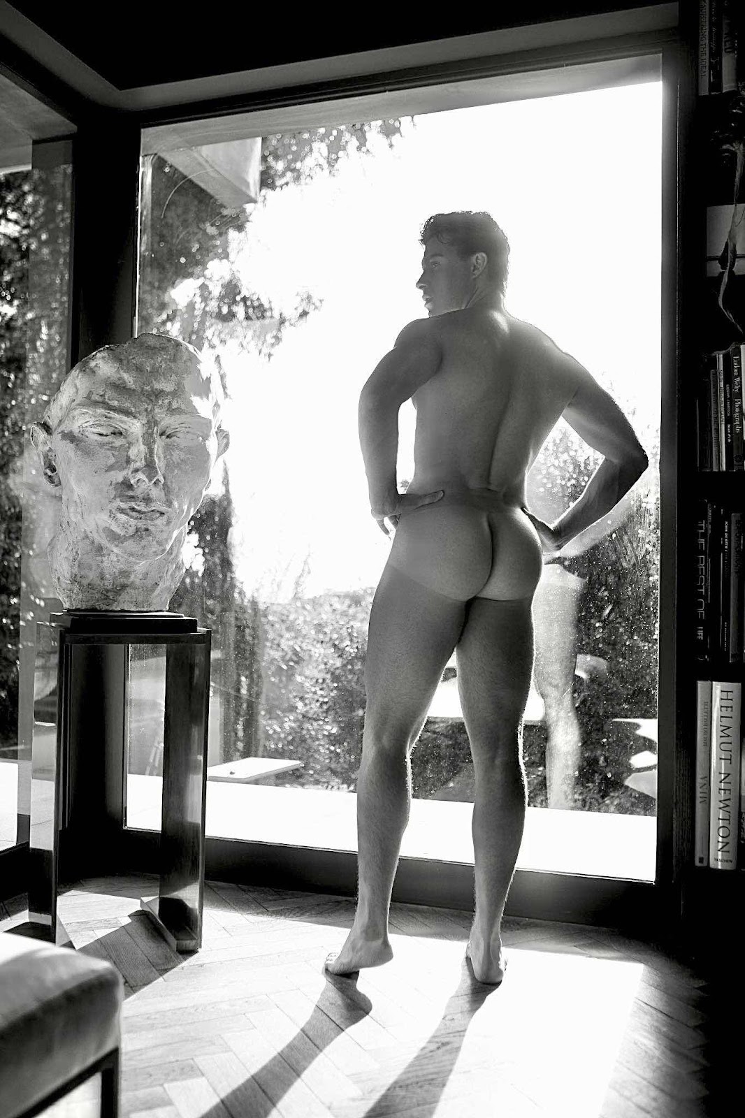 Beautiful image. Great contrast between the rough hewn surface of the sculpture and the fine jock’s smooth ass. No doubt photographed in the hills of Beverly or Hollywood in the library of a fine house, and the owner luvs photography books. -CA jock