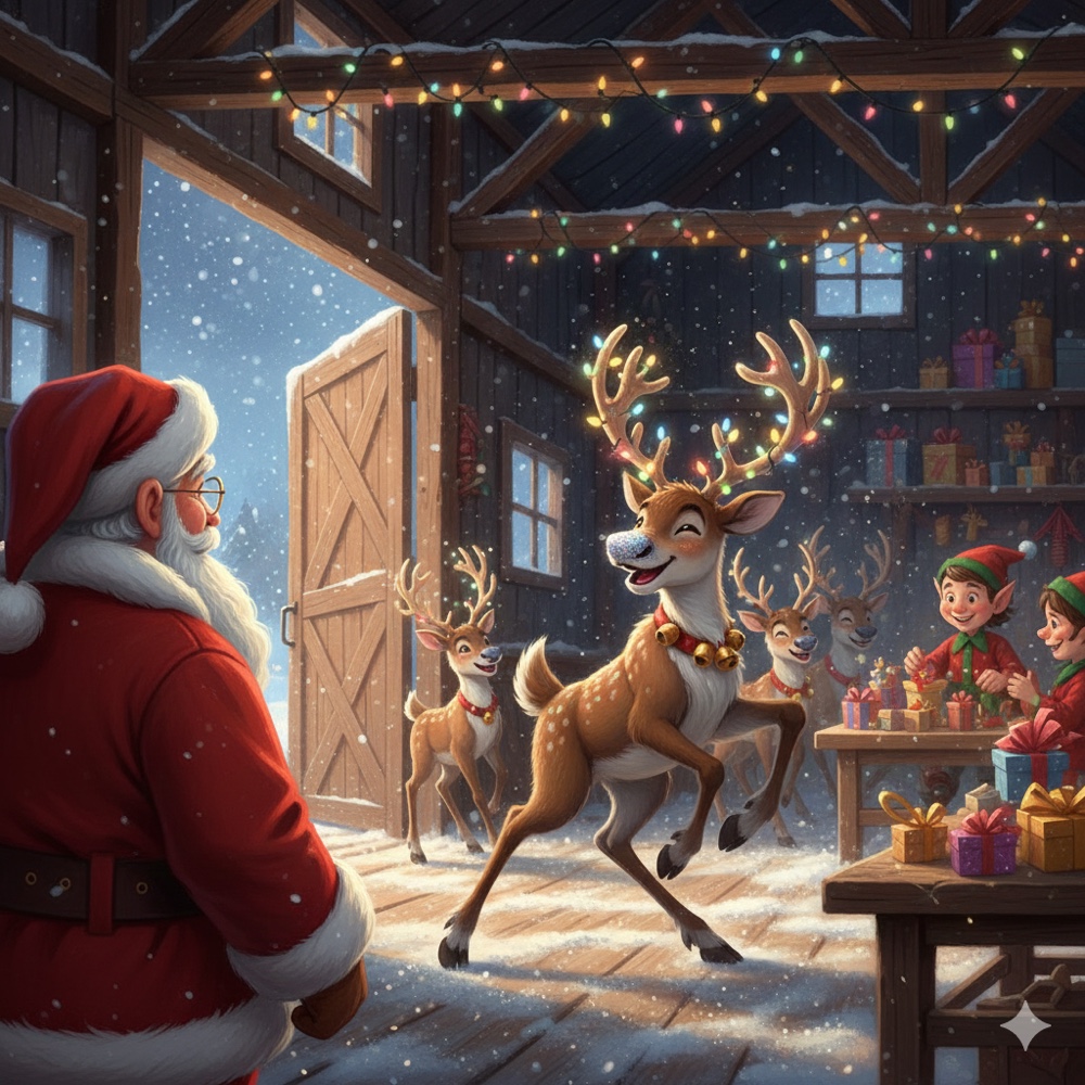Following the sound, Santa entered the reindeer barn and was greeted by a truly fabulous sight. A group of young reindeer were dancing and singing, led by a buck with glitter on his nose and a string of lights woven through his antlers. Bells jingled as he moved, creating the most wondrous music, and everyone present was clearly delighted.